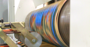 Flexo printing is a printing process that uses an image carrier to transfer graphics or text onto a substrate. The image carrier has raised areas that depict the artwork and is adhered to a cylinder. Ink is metered onto the image carrier by another cylinder, and as the image carrier cylinder rotates, the image is transferred onto a moving substrate.