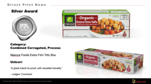 June 2024 – Here at Unicorr, our commitment to innovation and quality in flexographic printing continues to be recognized among the industry’s best. In May, we were honored at the Flexographic Technical Association’s (FTA) 2024 Excellence in Flexography Awards. We first earned a Silver Award in the Combined Corrugated, Process category for our “excellent tonality” and proof matching for the Nasoya Foods Extra Firm Tofu Box. Our Göpfert Promo Kit was again awarded in the Self Promo category, showcasing our ability to deliver standout promotional materials.